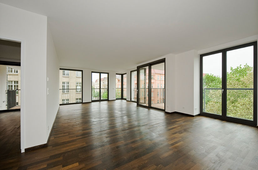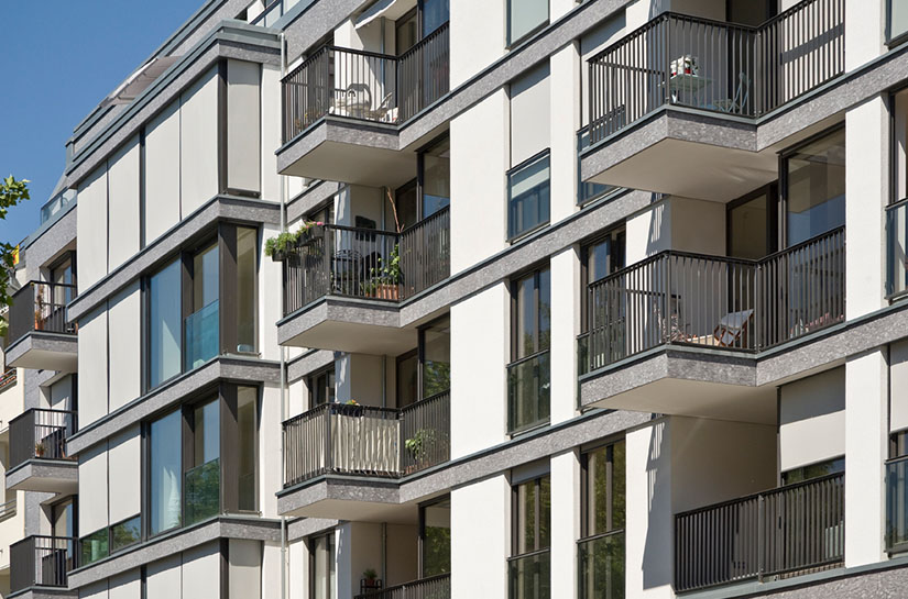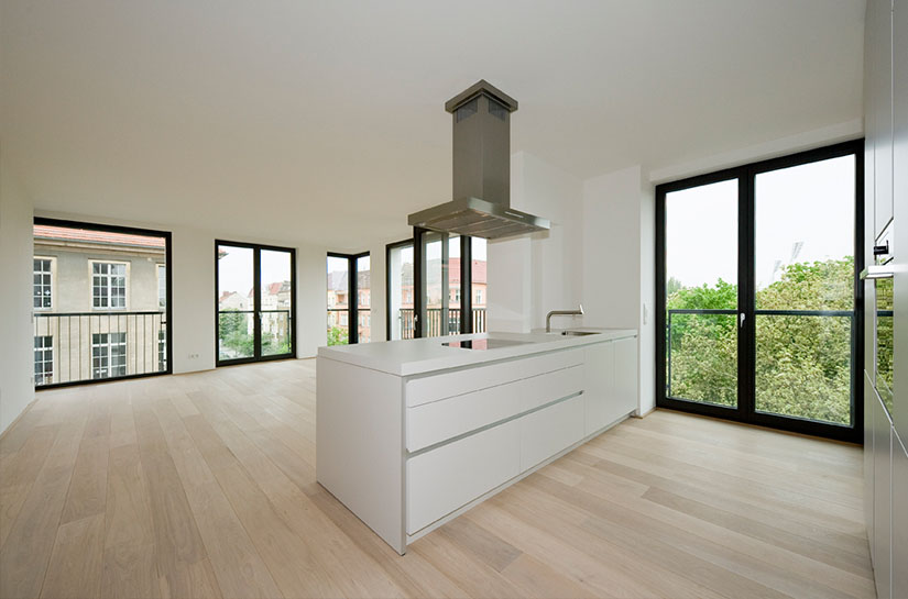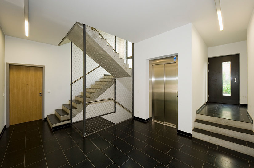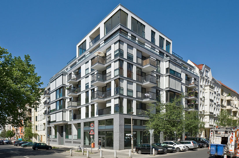 Wohn- und Geschäftshaus auf unbebautem Eckgrundstück mit 37 Wohnungen und 2 Gewerbeeinheiten, Tiefgarage mit 19 Stellplätzen, 2 – 5 Zimmerwohnungen von 65 – 200 m², drei- bzw. vierspännige Erschließung, hohe Individualität in der Wohnungsausstattung und Gestaltung, große süd- bzw. ostorientierte Loggien und Terrassen, raumhohe, teils raumbreite Verglasungen